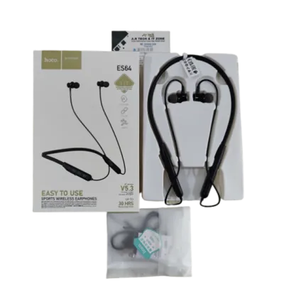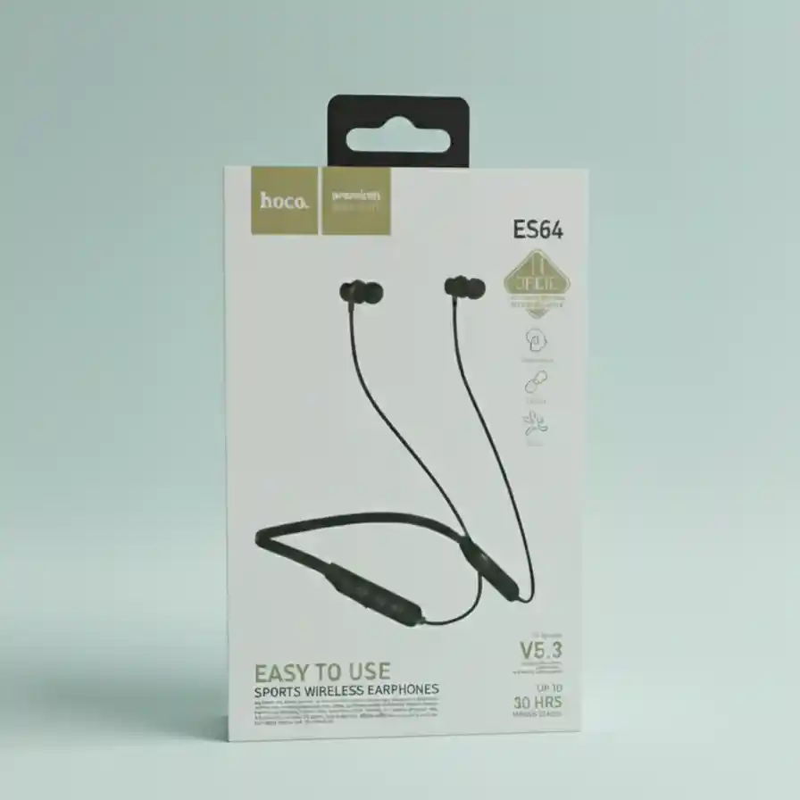 Hoco ES64 Sports Bluetooth Earphone Wireless NeckbandHoco ES64 Sports Bluetooth Earphone Wireless Neckband 30 Hour ChargeBrand : HocoModel : ES64Bluetooth 5.3Battery capacity: 200mAhCharging time: about 2 hoursUse time: 30h UseStandby time: 350hToggle the switch key, more convenient operationSupport Chinese and English prompt sound, double-click the multi-function key when not paired